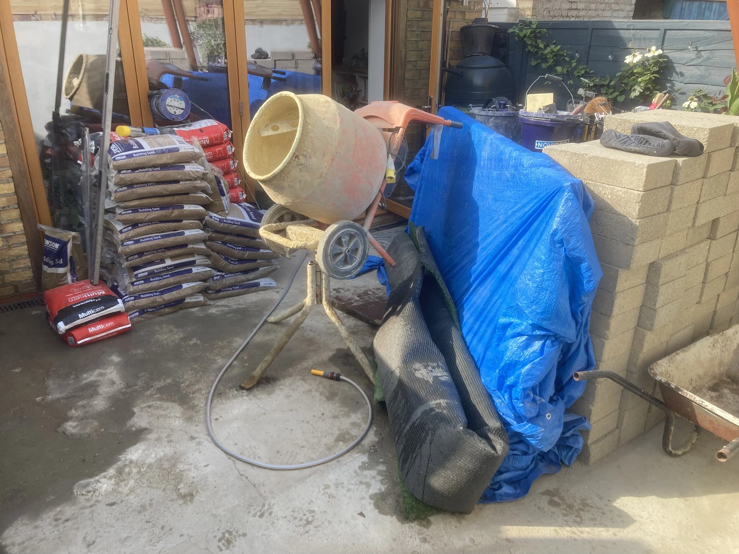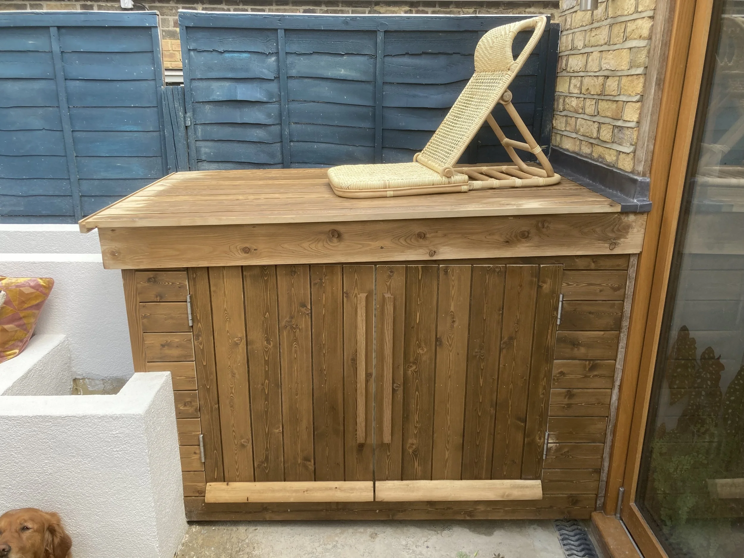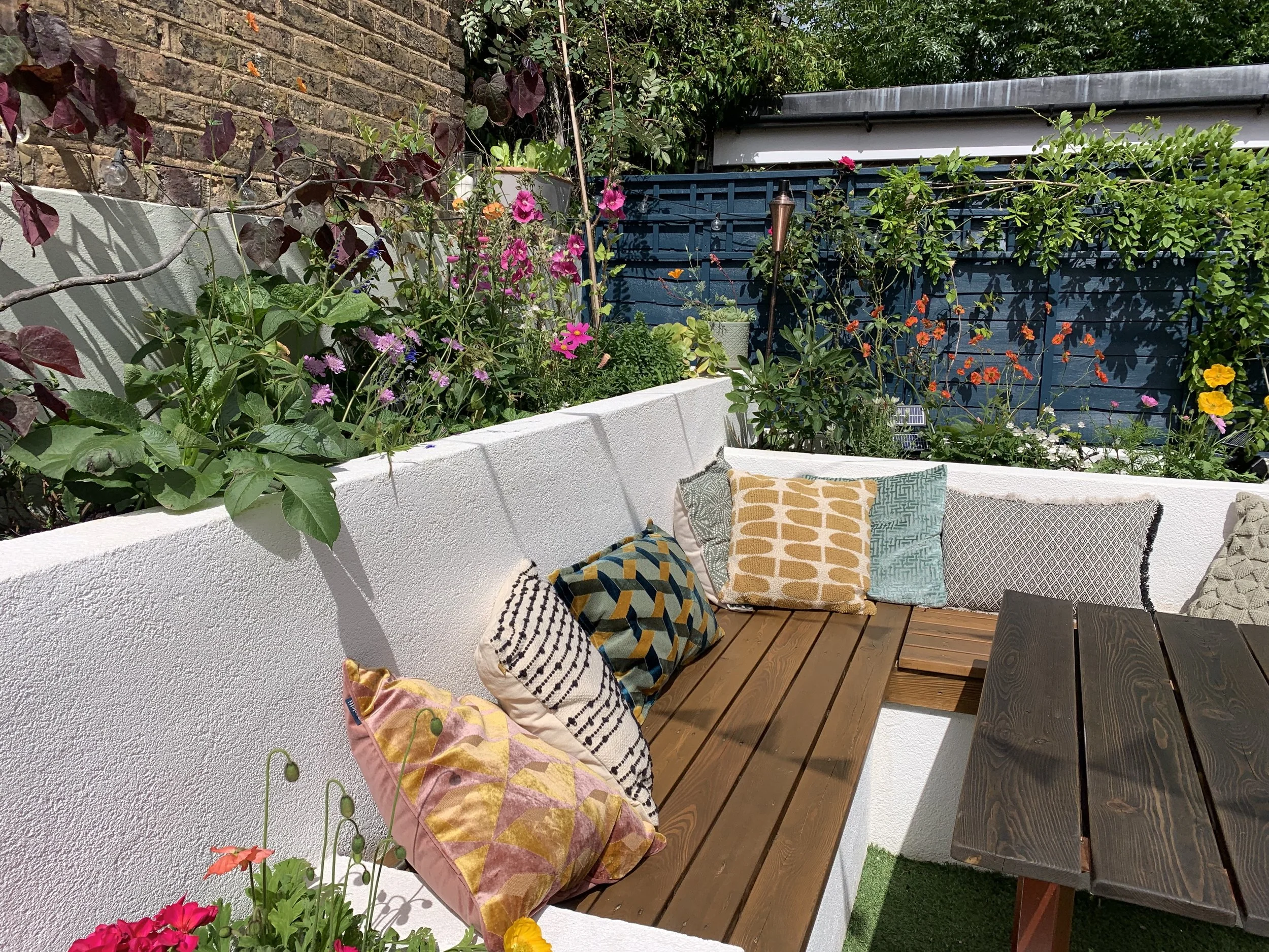 A complete transformation of a small terraced house garden in London. Good design, well planned drainage, long lasting block work and clever carpentry were all implemented to make a stylish and usable space in a trendy area of London. This was a little further than my usual commute and It was logistically challenging due to the lack of space and limited window of time. Nevertheless, the results have made it very worthwhile. The garden now features a freezer and storage shed (with roof that can be used to bathe in the last of the sun). Openable storage bench seats, rendered raised beds, a timber clad planter and a custom made table to suit. Paved flooring to come next….